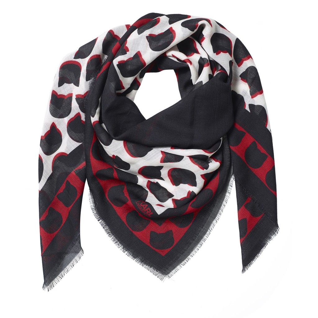Et pour affronter les éléments, rien de tel que ce bonnet aux oreilles de chat (45€) décliné en noir et en blanc et l’écharpe en laine (250€) pour s’emmitoufler en douceur d’un peu de Choupette.