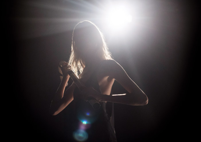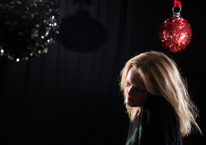 S’avançant dans la pénombre, le mannequin belge, armée d’un sucre d’orge géant, déambule entre des piñatas rouges et noires scintillantes en forme de boules de Noël, qu’elle explose une à une d’un coup sec.