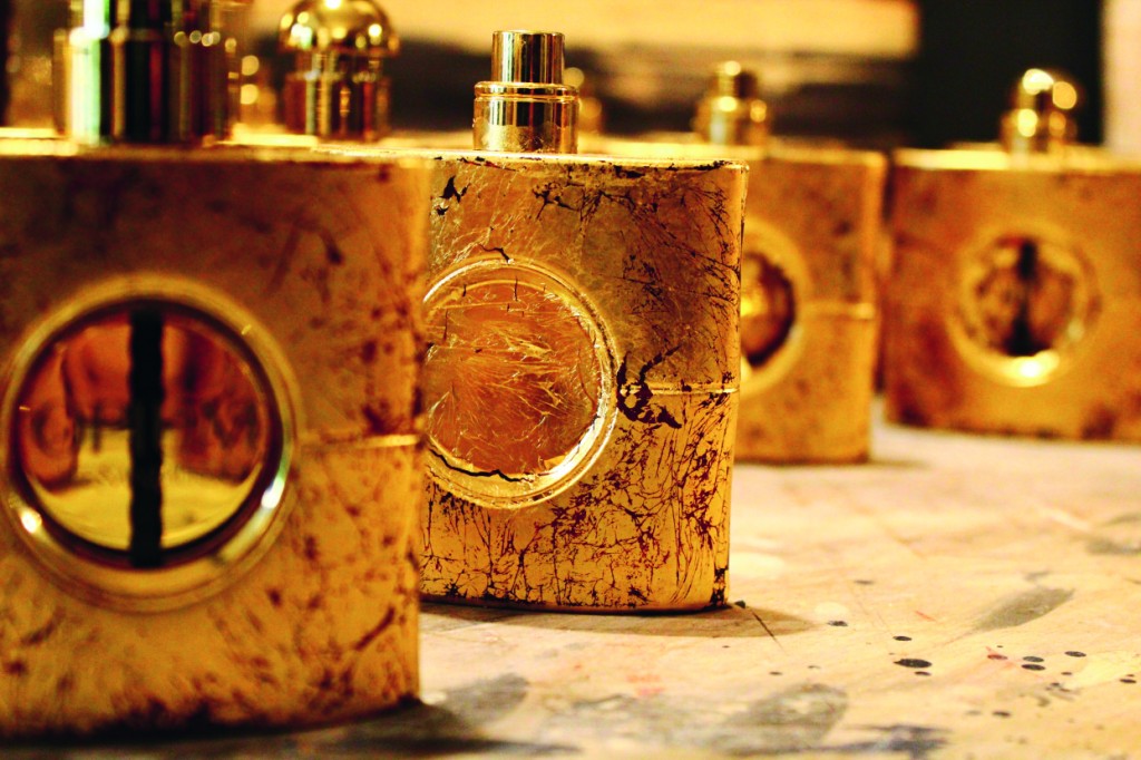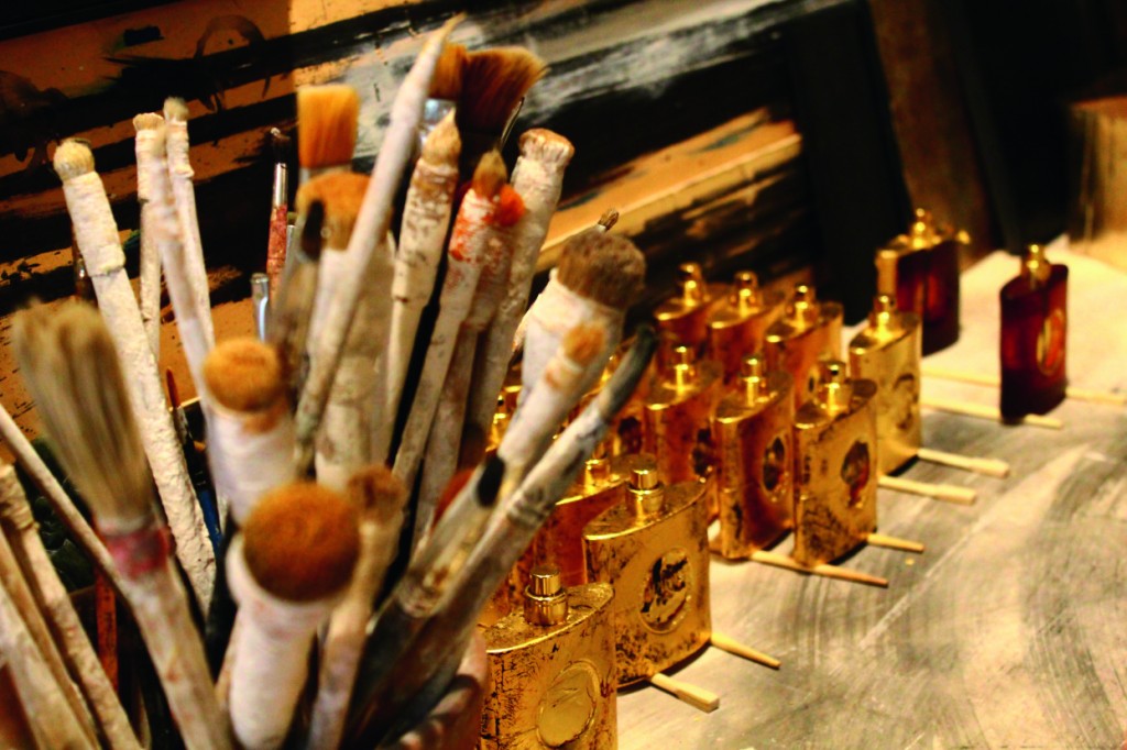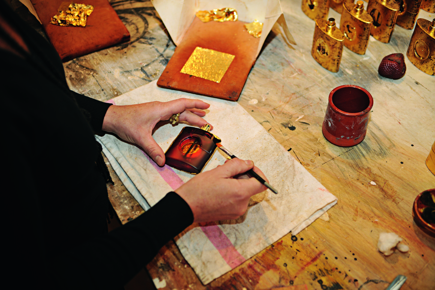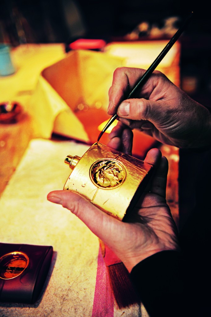 Façonné par l’artiste Manuela Paul-Cavallier, doreuse et artiste de pigment et feuilles d’or française, le flacon original de l’eau de parfum s’habille de précieuses feuilles d’or pur aux mille reflets dansants, évocatrices d’un paradis magique lointain.