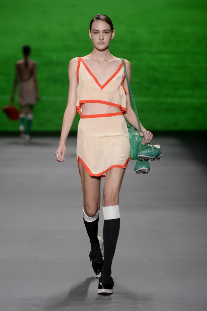 Les accessoires sont les ultimes clins d’œil effectués à cet univers du football. Les sacs à main prennent la forme de ballons ronds, les chaussettes se portent jusqu’aux genoux, et les chaussures à crampons sont à portée de main.