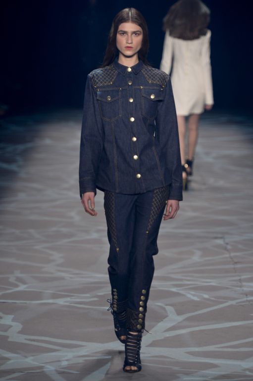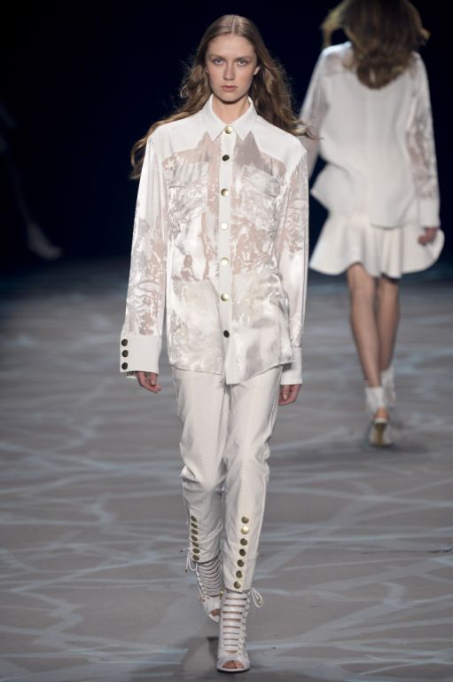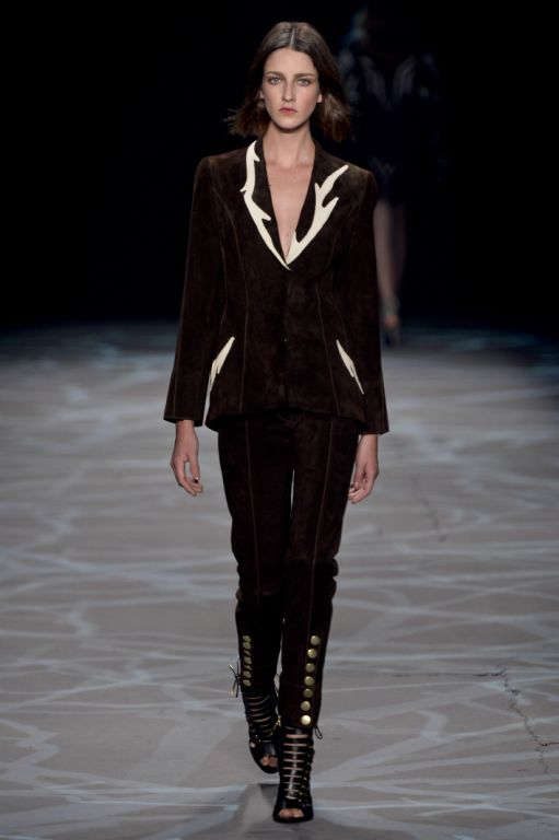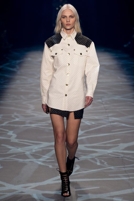 Emmenée par le top model international Aline Werber, les premières silhouettes dévoilent des chemises et des vestes épaisses, matelassés et boutonnés jusqu’au col. L’aspect lourd, donnant presque l’impression de porter une armure, fait ici écho aux tenues de camouflages revêtues par les chasseurs. Cette sensation de protection est accentuée par l’utilisation du cuir qui habille les épaules des silhouettes.