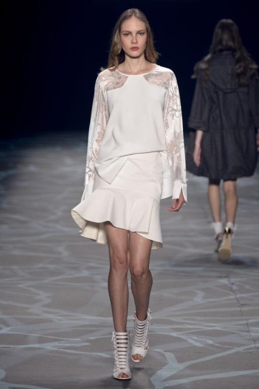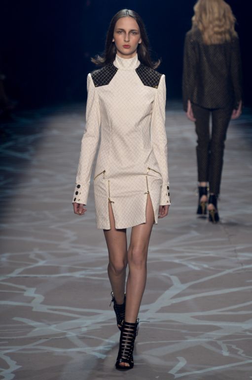 Les bas des silhouettes, plus sensuels, viennent adoucir cette première impression de rigidité. Les jupes sont courtes et fluides, parfois même fendues avec l’utilisation de zips ajustables et permettant de dévoiler en sensualité les jambes.