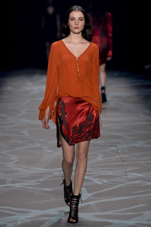C’est également par l’utilisation de couleurs automnales que le designer poursuit cette métaphore de l’escapade en forêt. Orange, rouge, bordeaux, jaune moutarde et blanc cassé sont les teintes privilégiées pour rehausser certaines silhouettes.