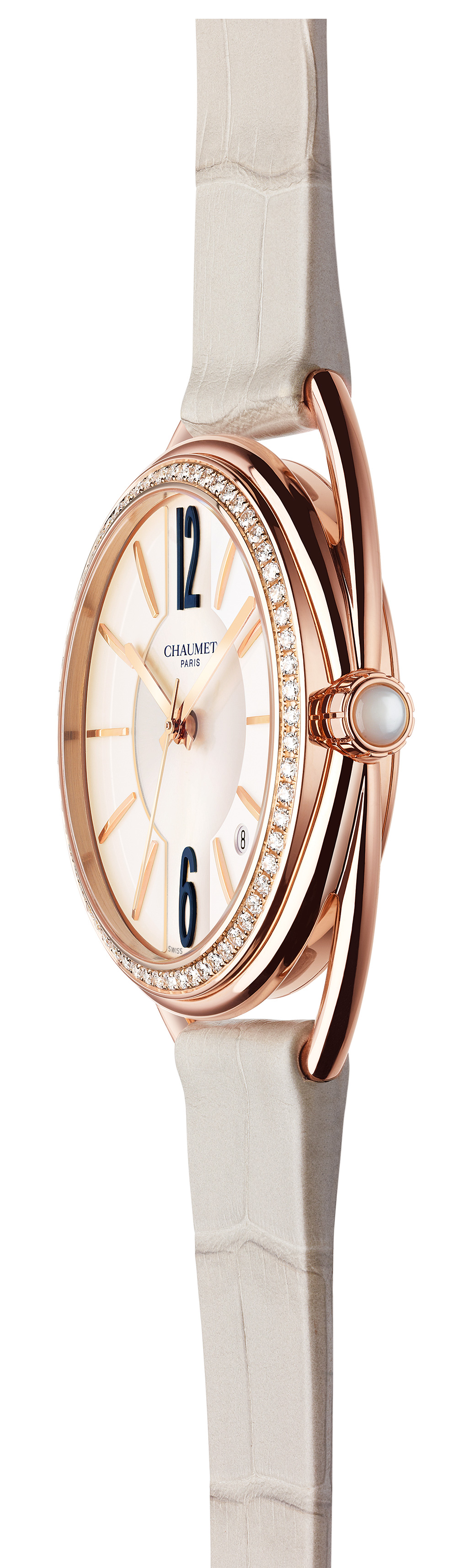 Dans un mouvement ininterrompu, un lien graphique entoure le boîtier et vient se croiser sur le profil avant de s’échapper pour créer deux anses unissant le cadran au bracelet avec grâce et légèreté.