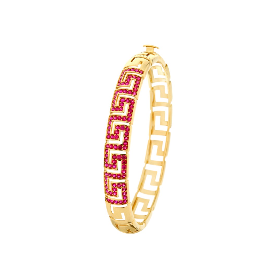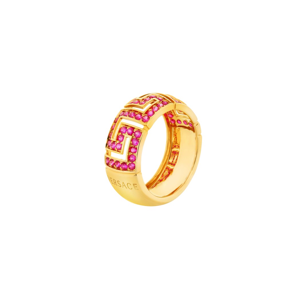 La collection, qui se compose d’un pendentif, de boucles d’oreilles, d’un bracelet et d’une bague le tout en or jaune serti de rubis, réinterprète avec un extrême raffinement l’iconique clé grecque de la célèbre maison de couture italienne.