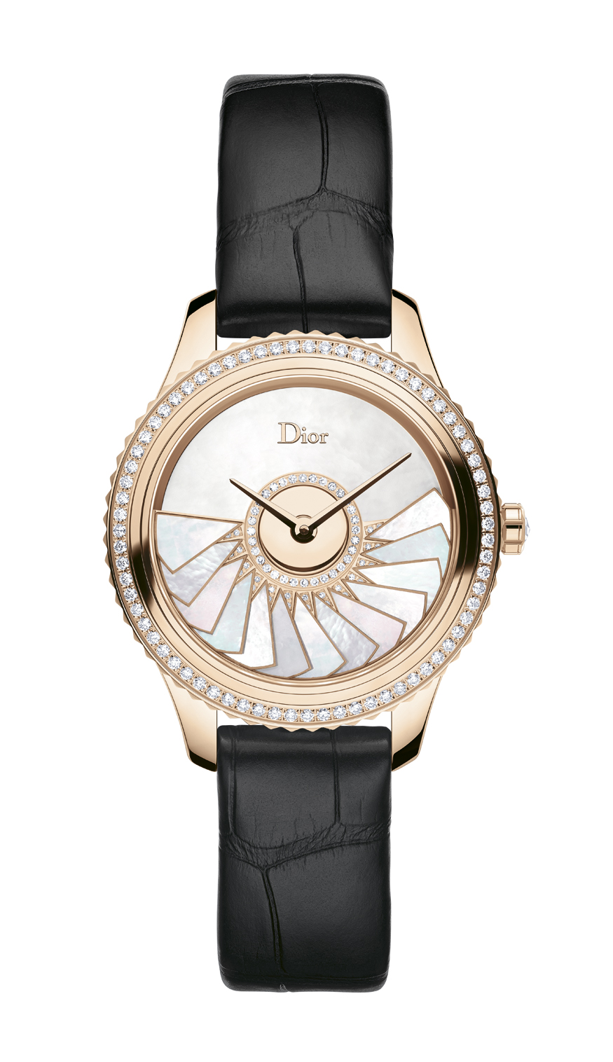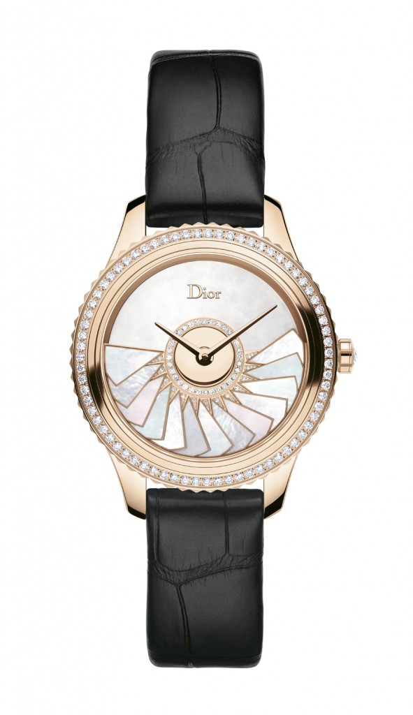 Le soir venu, la Dior VIII Montaigne se fait bijou devenant la montre de l’exceptionnel dans sa version Grand Bal, parée d’une masse oscillante placée à l’avant du cadran qui revêt pour l’occasion une jupe de nacre colorée aux allures de robe plissé soleil virevoltant au rythme de la danse.