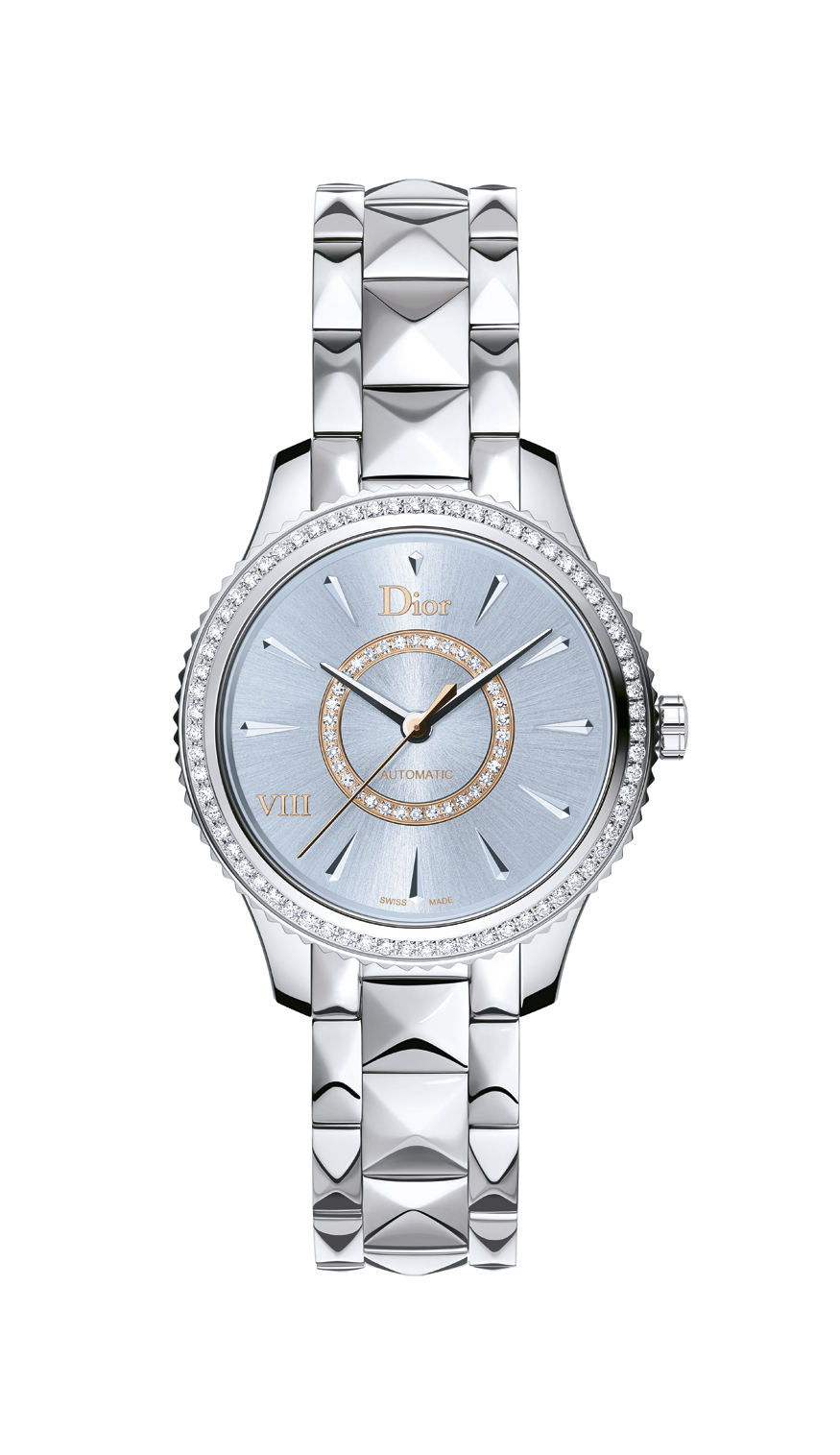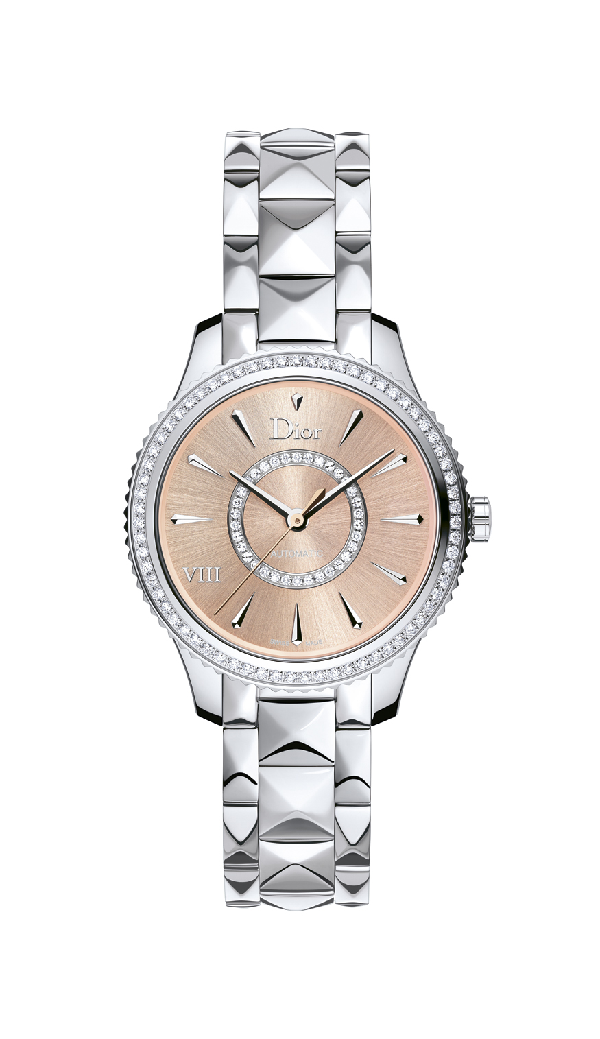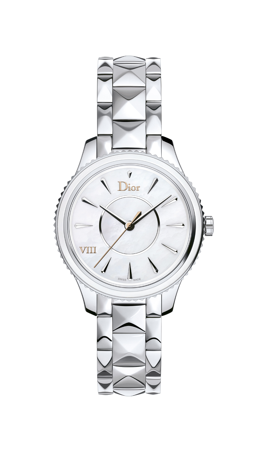 Élégante, raffinée et intemporelle, Dior VIII Montaigne affiche des lignes sensuelles et douces avec un boîtier affiné et sur le bracelet, des pyramides aux arêtes adoucies qui rappellent la veste emblématique du tailleur Bar, la silhouette si caractéristique du New Look imaginé par Christian Dior.