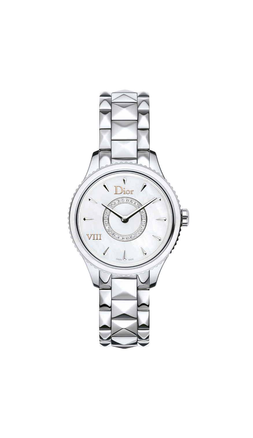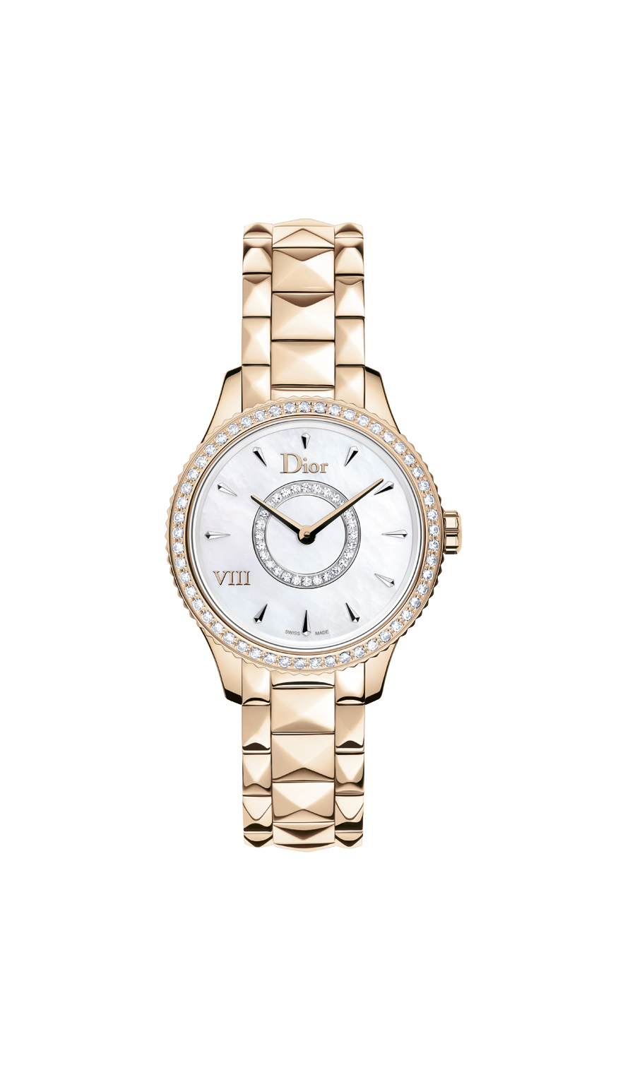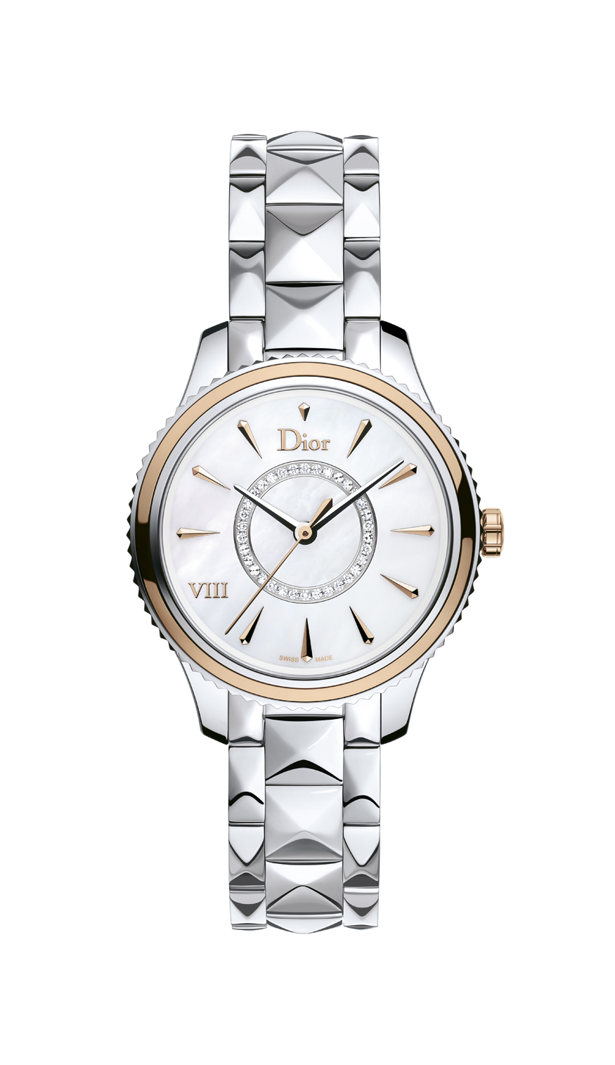 Élégante, raffinée et intemporelle, Dior VIII Montaigne affiche des lignes sensuelles et douces avec un boîtier affiné et sur le bracelet, des pyramides aux arêtes adoucies qui rappellent la veste emblématique du tailleur Bar, la silhouette si caractéristique du New Look imaginé par Christian Dior.