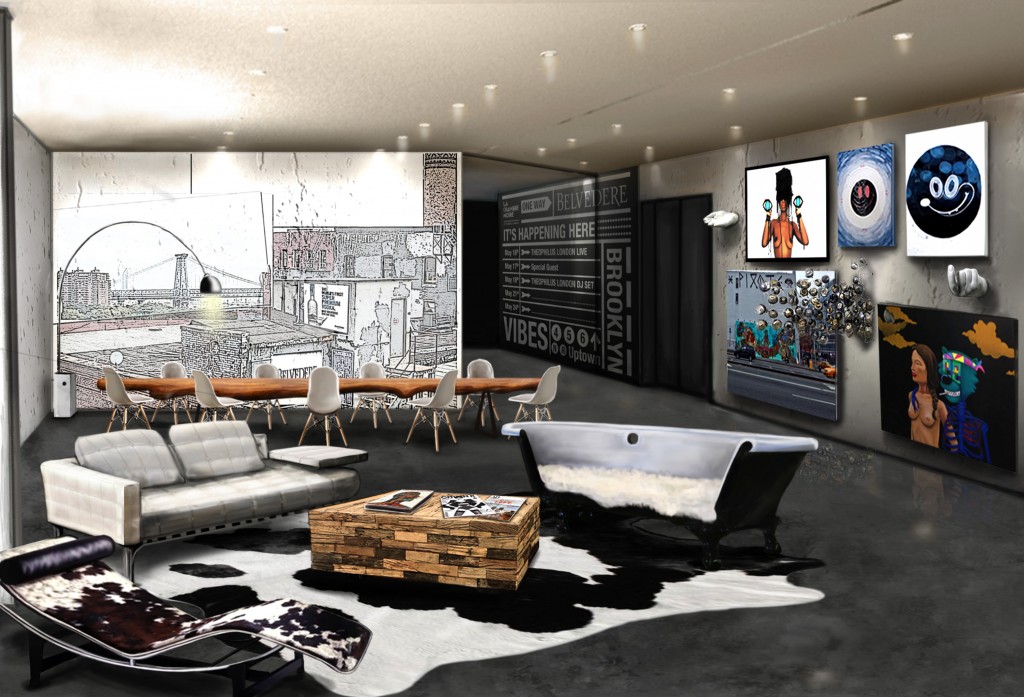 Dans un esprit loft de Brooklyner, une gigantesque fresque murale dessinée au crayon accroche le regard tandis qu’une vue des toits, des skyscrapers et plus loin, d’une partie du célèbre Pont de Brooklyn habille l’espace de béton ciré.