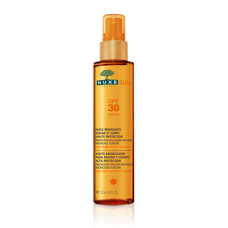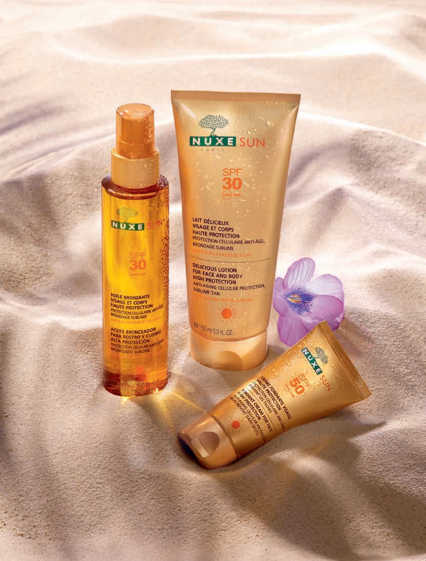 Des filtres protecteurs, un coeur d’actifs aux Fleurs d’Eau et de Soleil, un activateur de bronzage naturel, une protection cellulaire anti-âge, des textures délicieuses et un parfum de rêve : Nuxe Sun, c’est l’assurance d’une protection idéale et d’un bronzage sûr, durable et somptueux, 100% glamour.