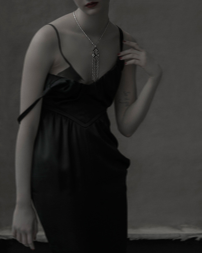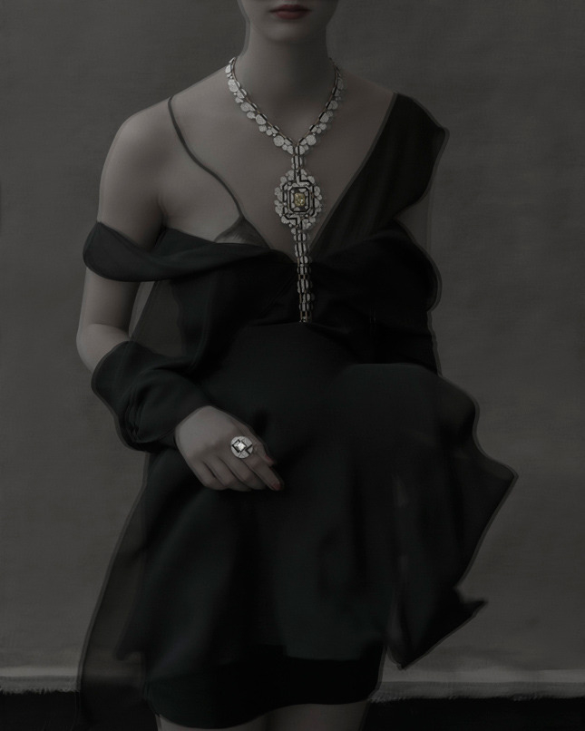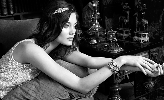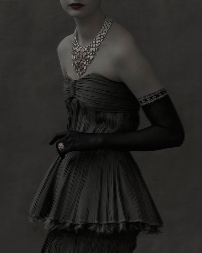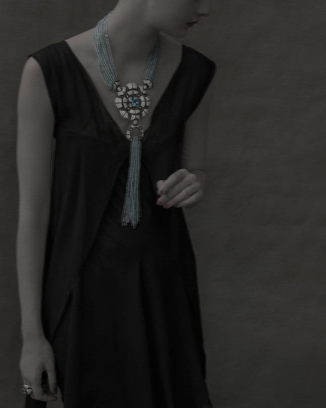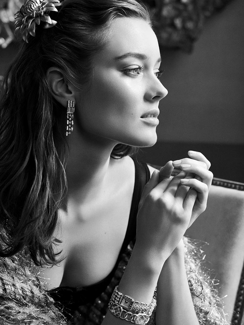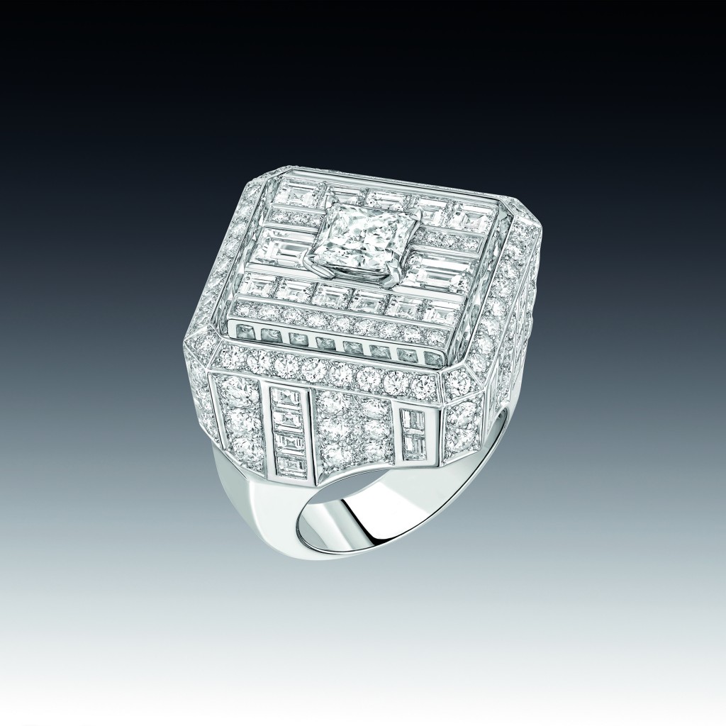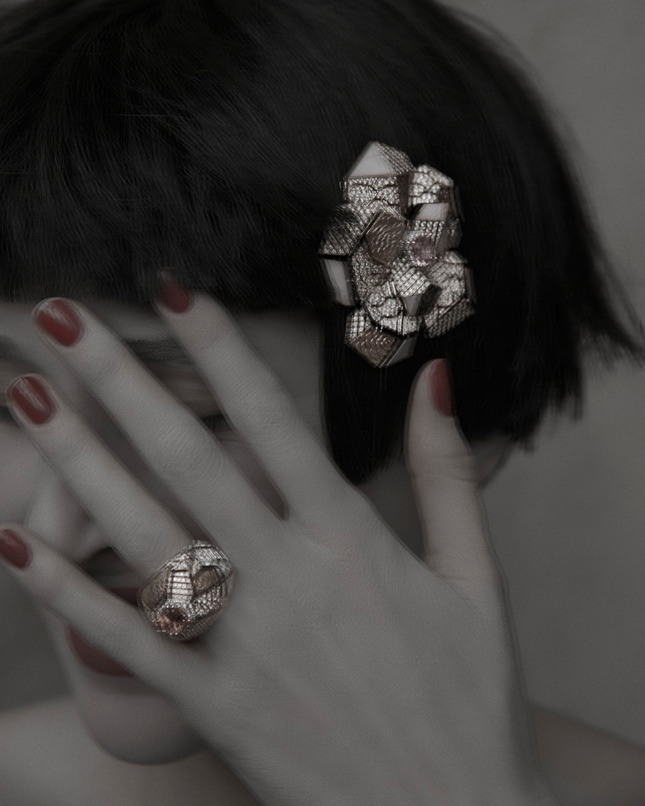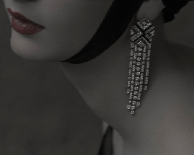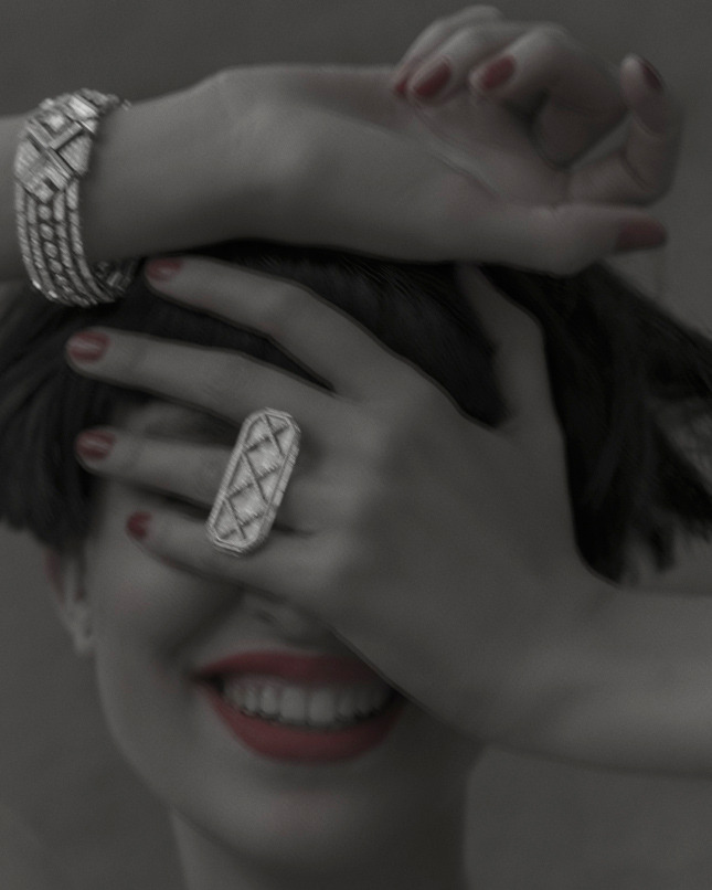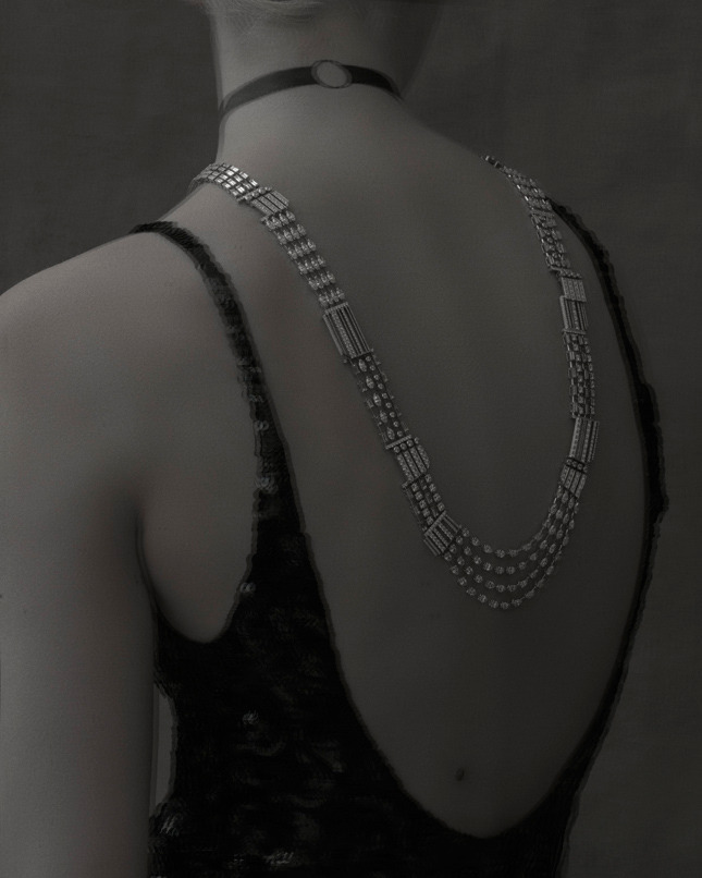 L’audace art déco se conjugue avec la rigueur géométrique d’un art joaillier minutieux dans de somptueuses parures scintillant sur la peau, accompagnant chaque geste de lumière dans une symphonie de pierres précieuses.