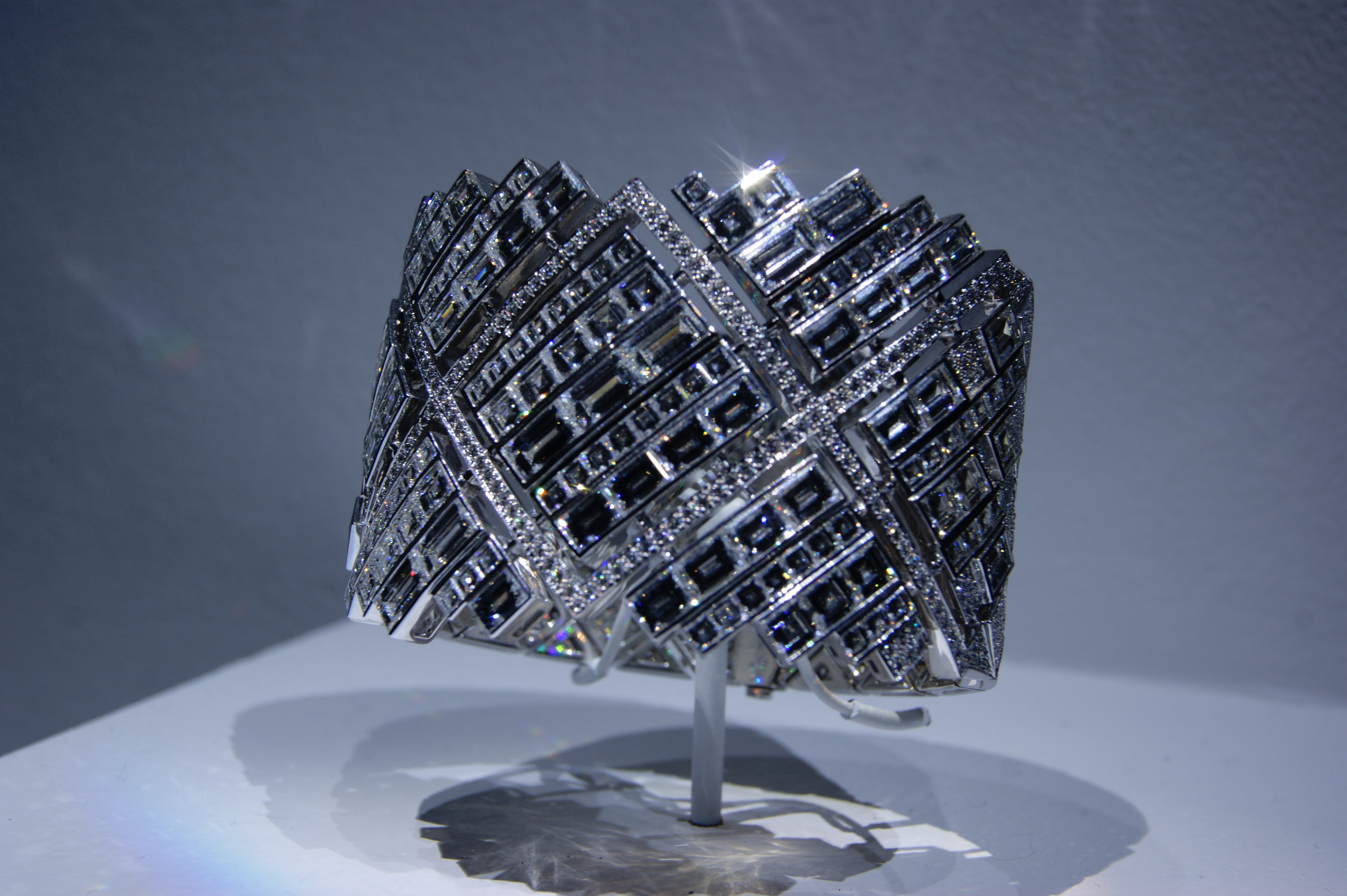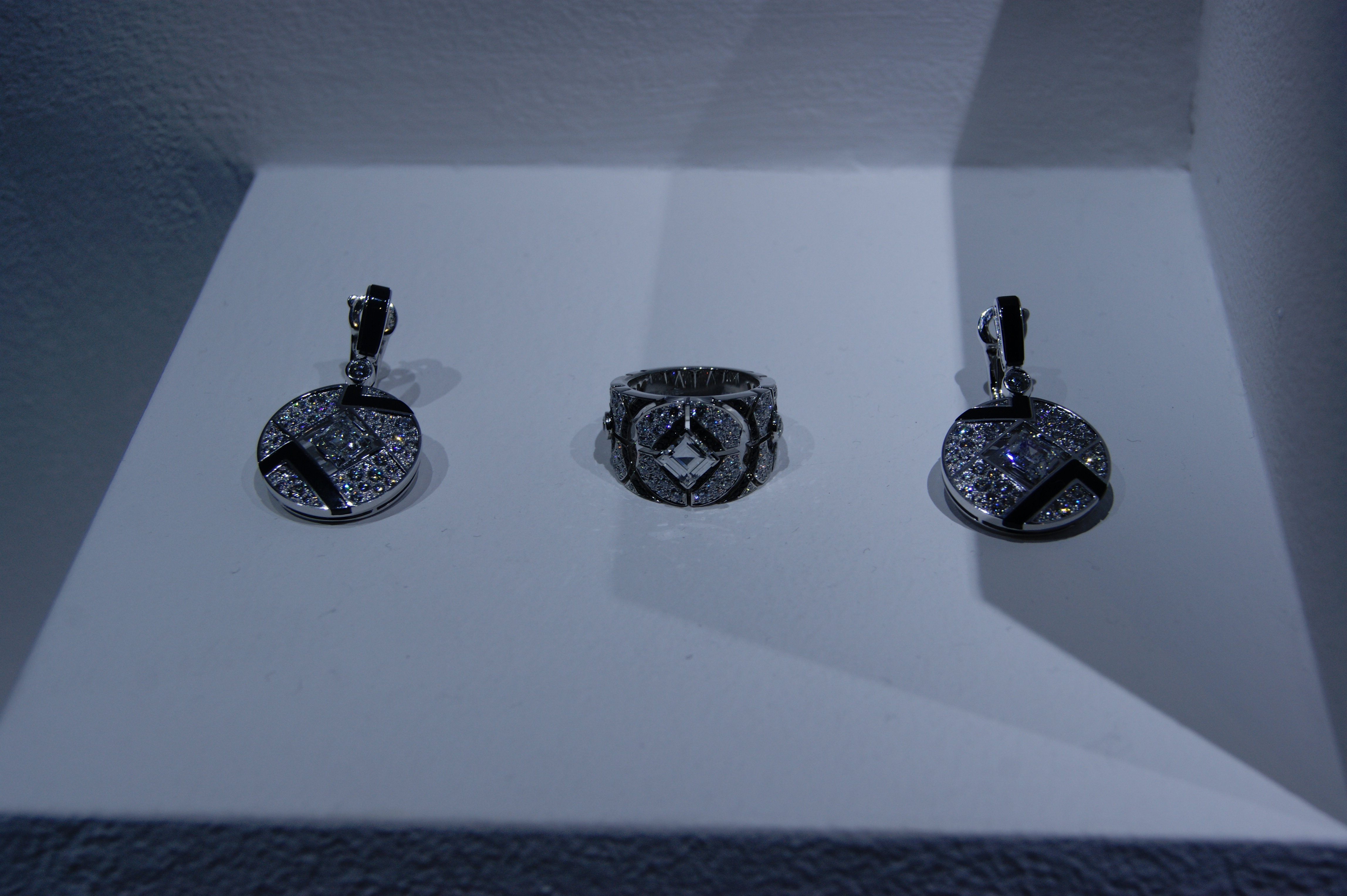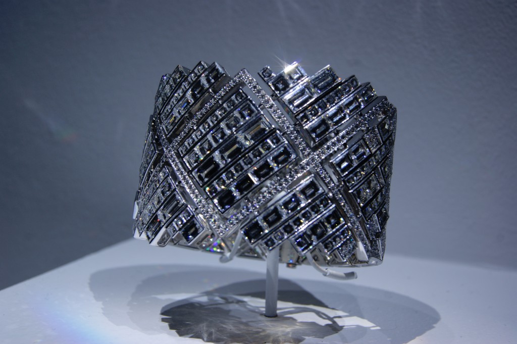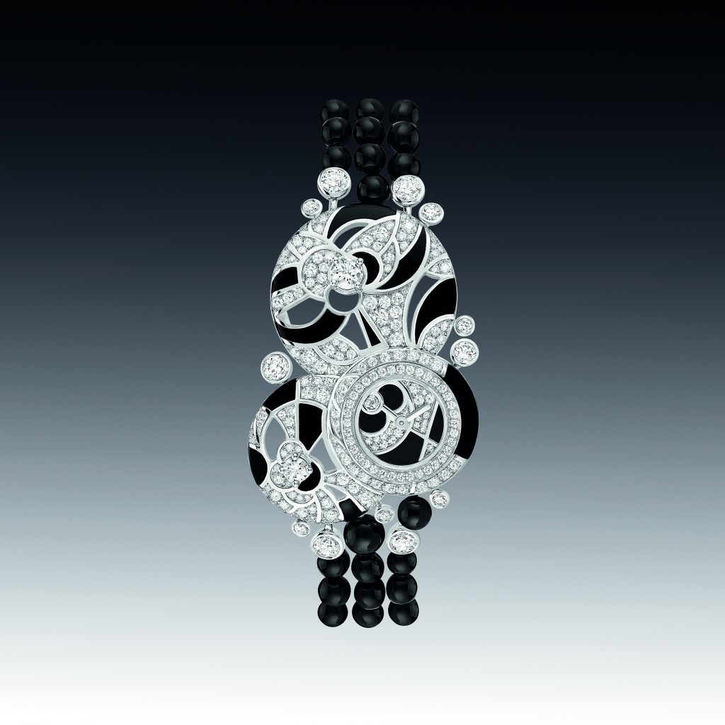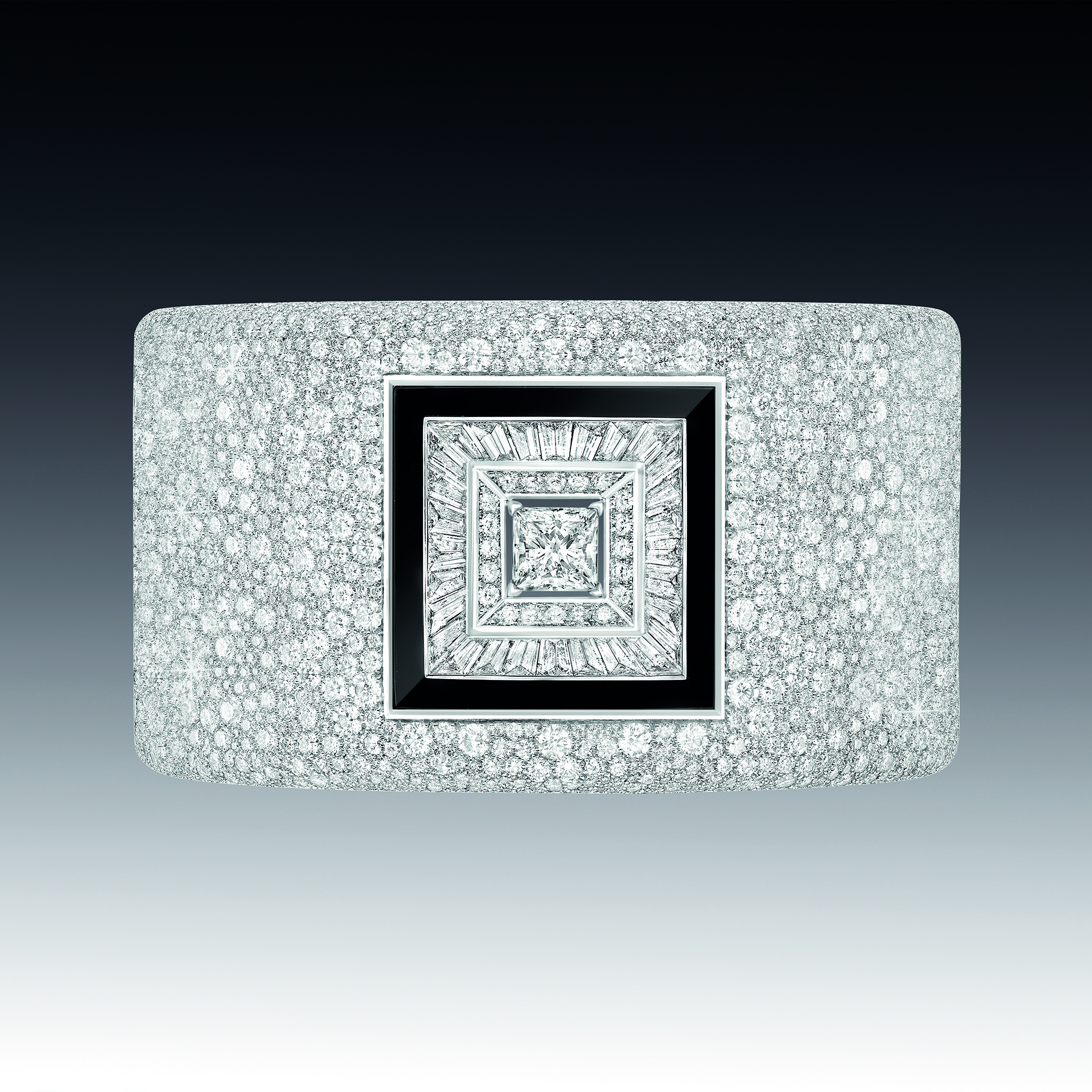 Chaque pièce, géométriques, scintille de mille diamants rehaussés par les lignes graphiques de l’onyx noir sculpté. Le serti neige du bracelet, véritable prouesse technique, est ainsi à couper le souffle.