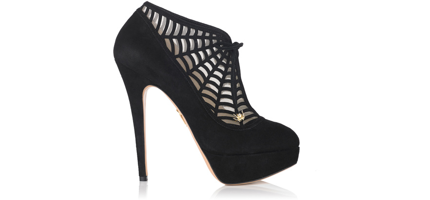 Inspirées par les rituels de cette fête légendaire, elles laissent les araignées envahir le veau velours des plateformes Dolly et le daim des bottines Minerva.