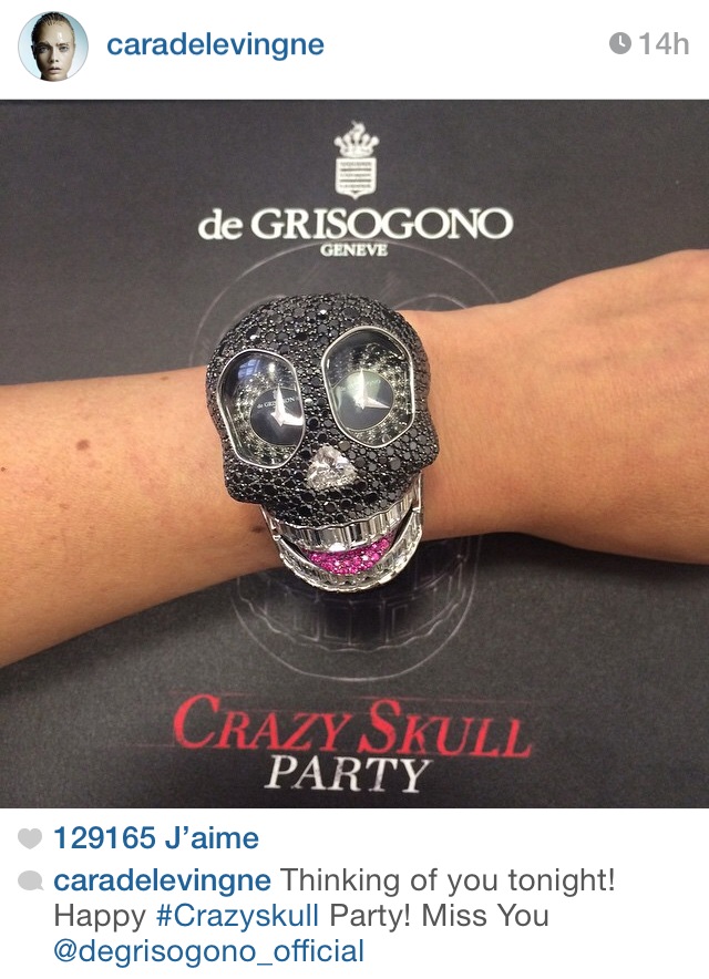De son côté Cara Delevingne déjà présente à la soirée de Grisogono à Cannes en mai dernier, a fait part son regret de ne pouvoir assister à cette incroyable soirée parisienne, en postant une photo de la montre à son poignet.