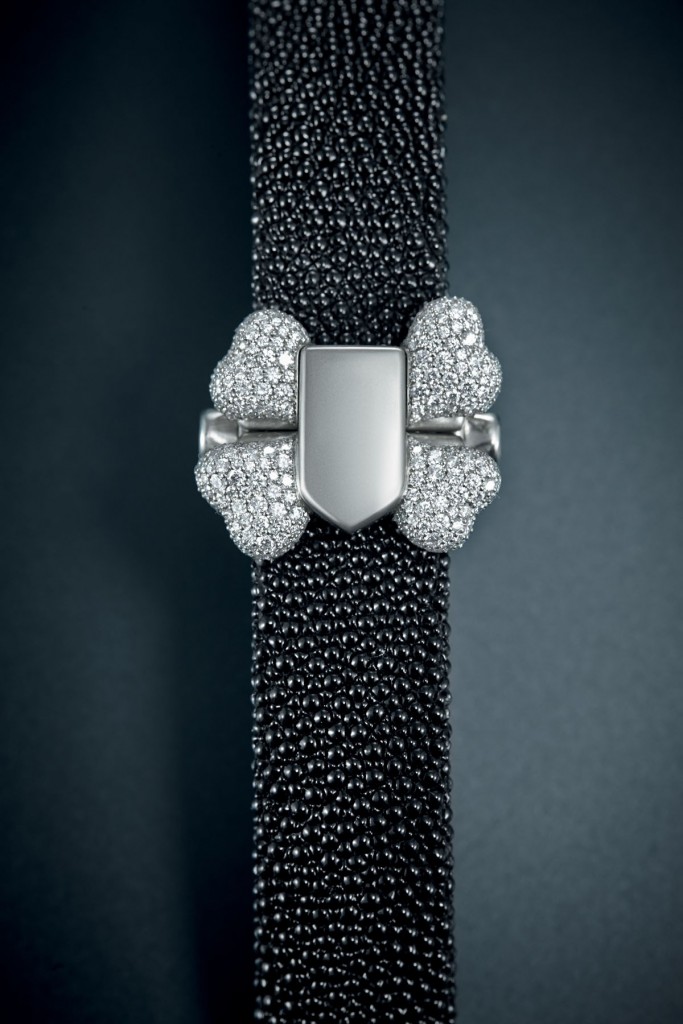 Finition ultime, son bracelet en galuchat se distingue par un fermoir réhaussé de deux os pavés de diamants ou de rubis.