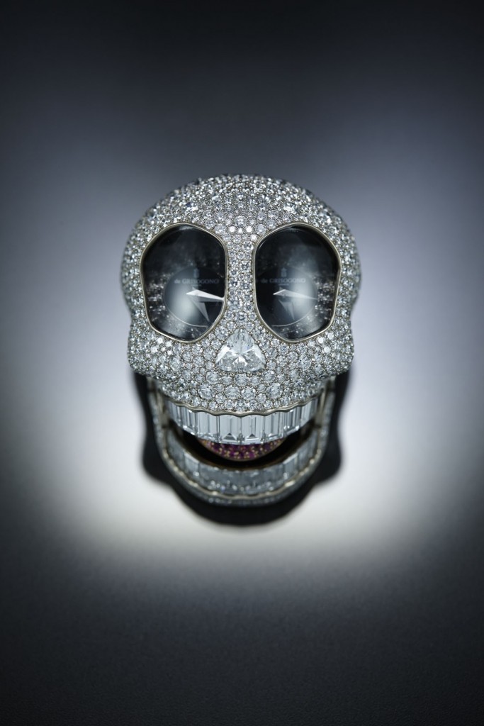 Près de 45 carats de pierres sertissent chacun de ses traits, de son crâne à sa langue. Certaines pierres sont taillées sur mesure à partir de pierres brutes, à l’image de son nez et de ses dents. Le temps s’écoule à travers un double fuseau horaire, animé par le mouvement à quartz SF 10-44, qui orne deux yeux magnétiques pavés de diamants.
