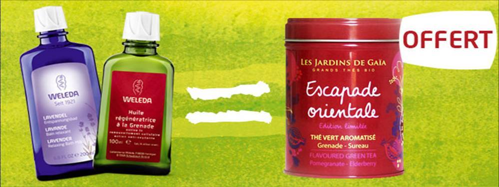 Weleda et les Jardins de Gaïa s’associent pour éveiller vos sens et vous offrir une escapade orientale des plus envoûtantes. Parfait pour nos soirées cocooning de l’hiver ! En effet, pour deux soins achetés parmi les huiles de beauté et les bains, Weleda vous offre une boîte de thé vert bio aromatisée Les Jardins de Gaïa aux douces saveurs orientales épicées.