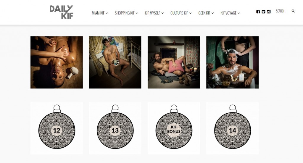 Jusqu’au 24 décembre 2014, Daily Kif remplit de mille et une merveilles le pied de votre sapin en proposant un cadeau par jour offert présenté par un homme sexy, un mannequin, un artiste ou un comédien sélectionné pour son charme et son bagou immortalisé dans une jolie maison montmartroise pour l’occasion.