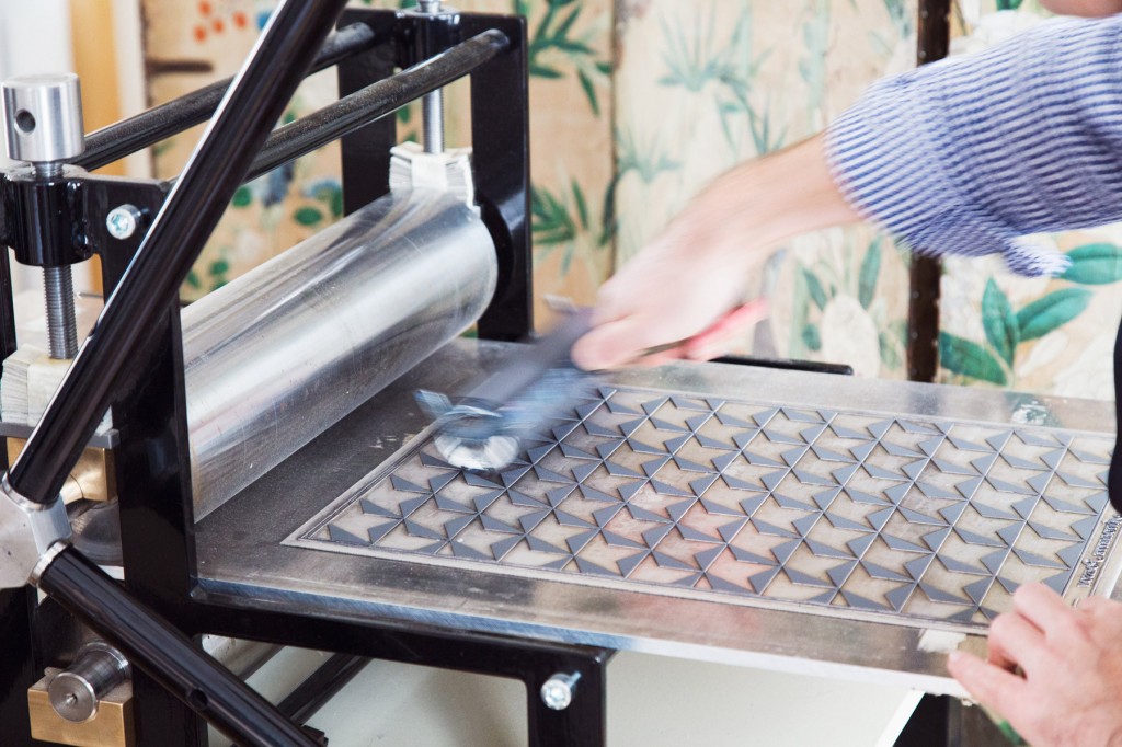 Pour l’impression du domino sur le cuir, Hélène a opté pour deux techniques : l’impression traditionnelle au cadre pour les couleurs et la technique de gravure à chaud sur cuir, la plus proche de celle utilisée pour la réalisation du papier dominoté. C’est un travail complexe et délicat, chaque couleur nécessitant la fabrication d’un outil spécifique et de même pour la dorure à chaud.