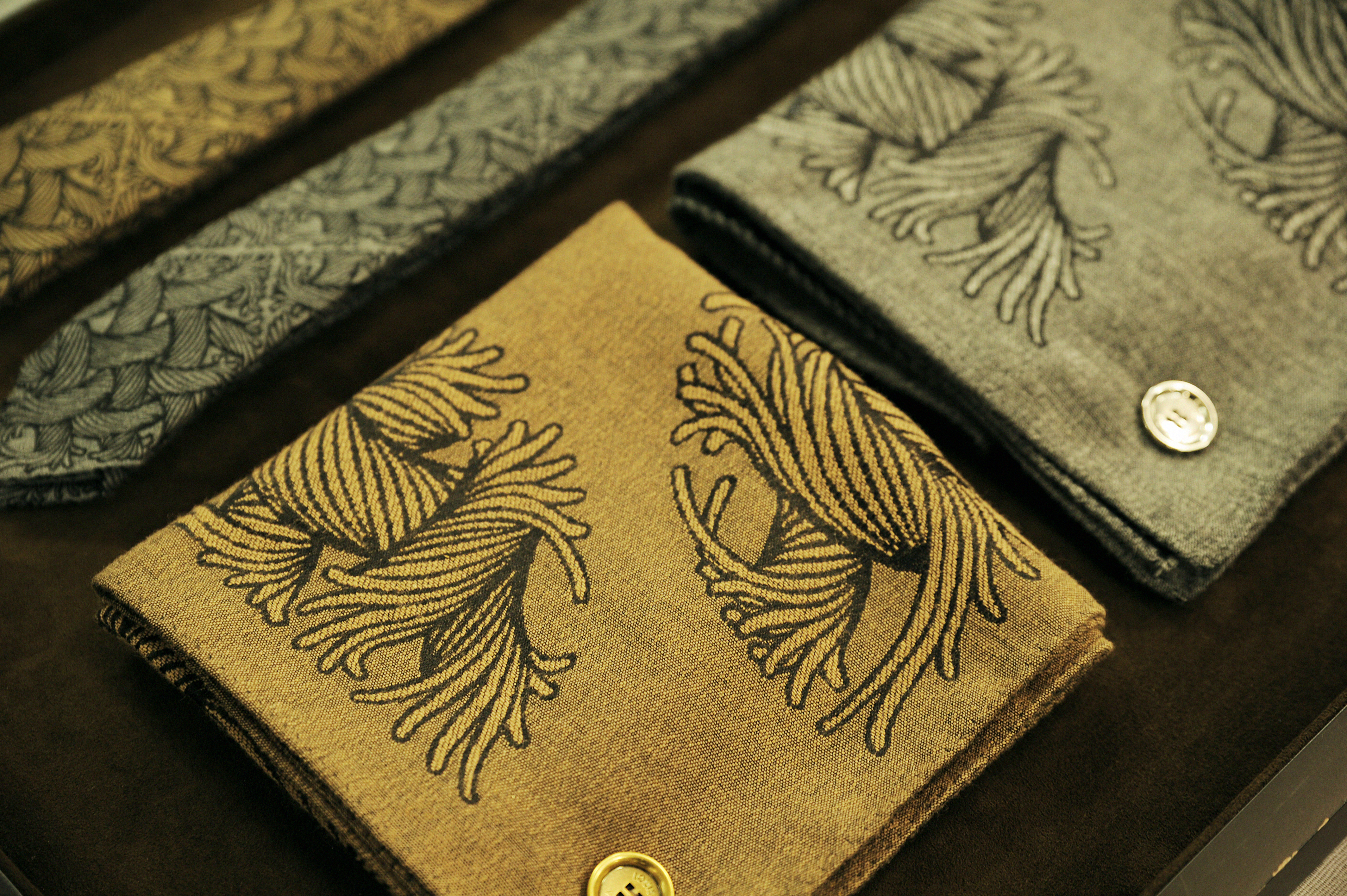 Kim Jones a puisé quatre dessins originaux dans ses archives pour les appliquer sur des pièces maîtresse de la collection et propose une silhouette graphique qui souligne la taille et porte une attention extrême aux détails. Manteaux, pulls et pantalons en cachemire aux couleurs d’automne se parent ainsi de fils entrelacés.