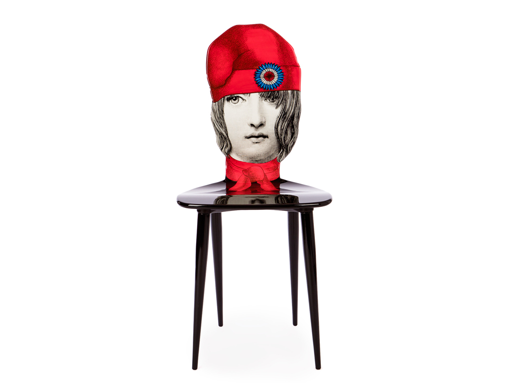 Comme c’est le cas pour toutes les créations de l’atelier Fornasetti, la chaise, la petite table, et les deux plateaux illustrés du motif Marianne sont tous imprimés, laqués et peints à la main dans une édition numérotée annuelle.