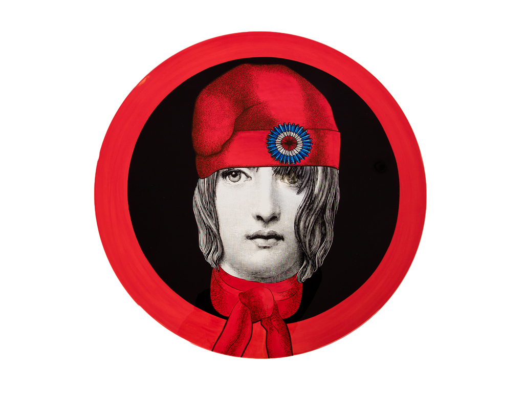Cette Marianne reprend les codes du visage emblématique de la France détournés avec grâce et fantaisie dans l’esthétique Fornasetti. Le visage de la muse Lina Cavalieri devient ainsi celui d’une jeune fille portant un bonnet phrygien, dans un subtil portrait où la couleur rouge occupe une place de choix.