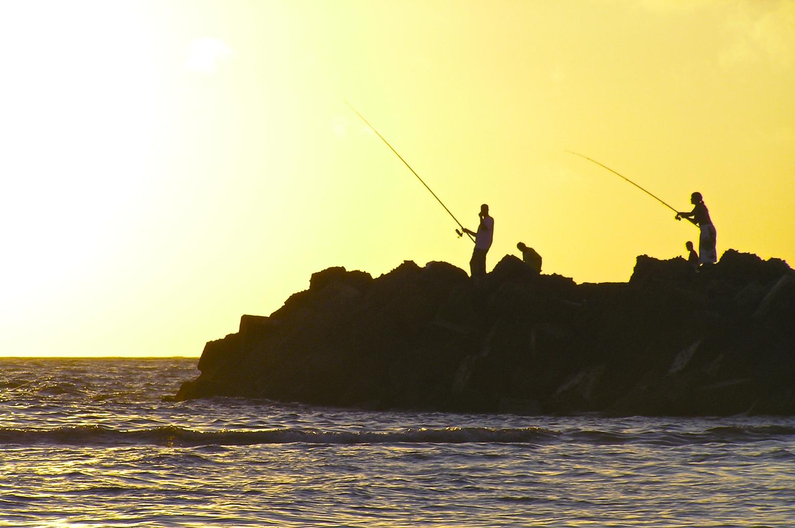 En Espagne, les dernières minutes de soleil du jour teintant le ciel d’une lumière jaune sont le prétexte d’une partie de pêche entre amis immortalisée par Neville Morgan.