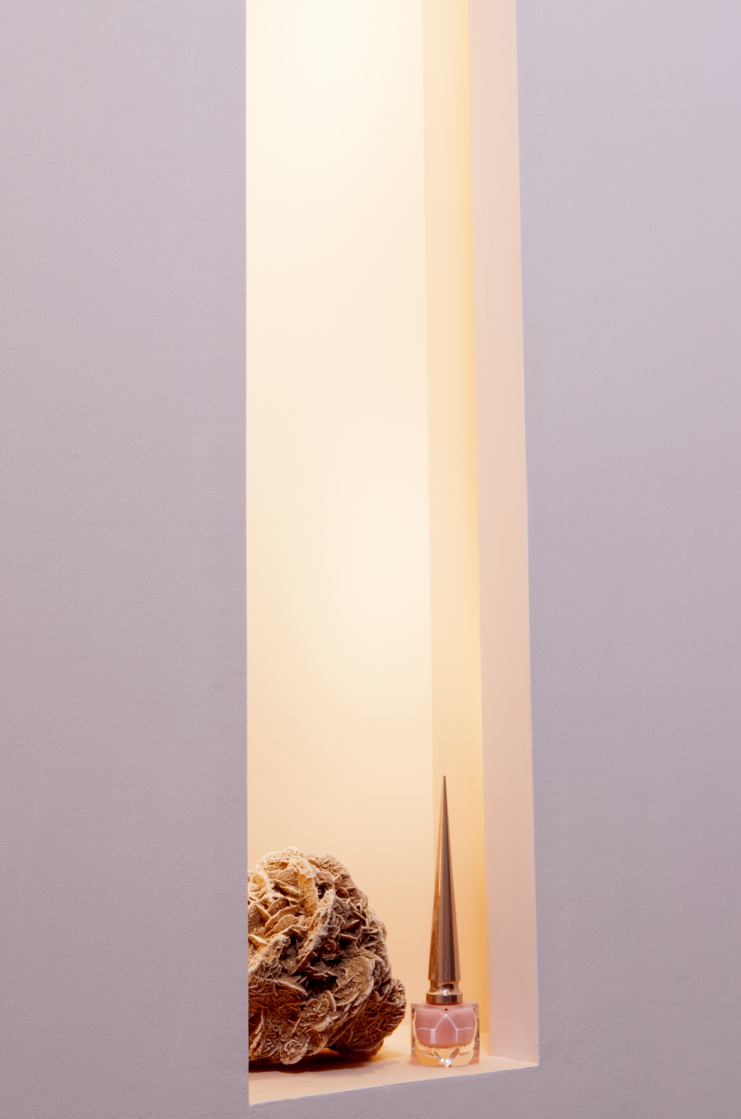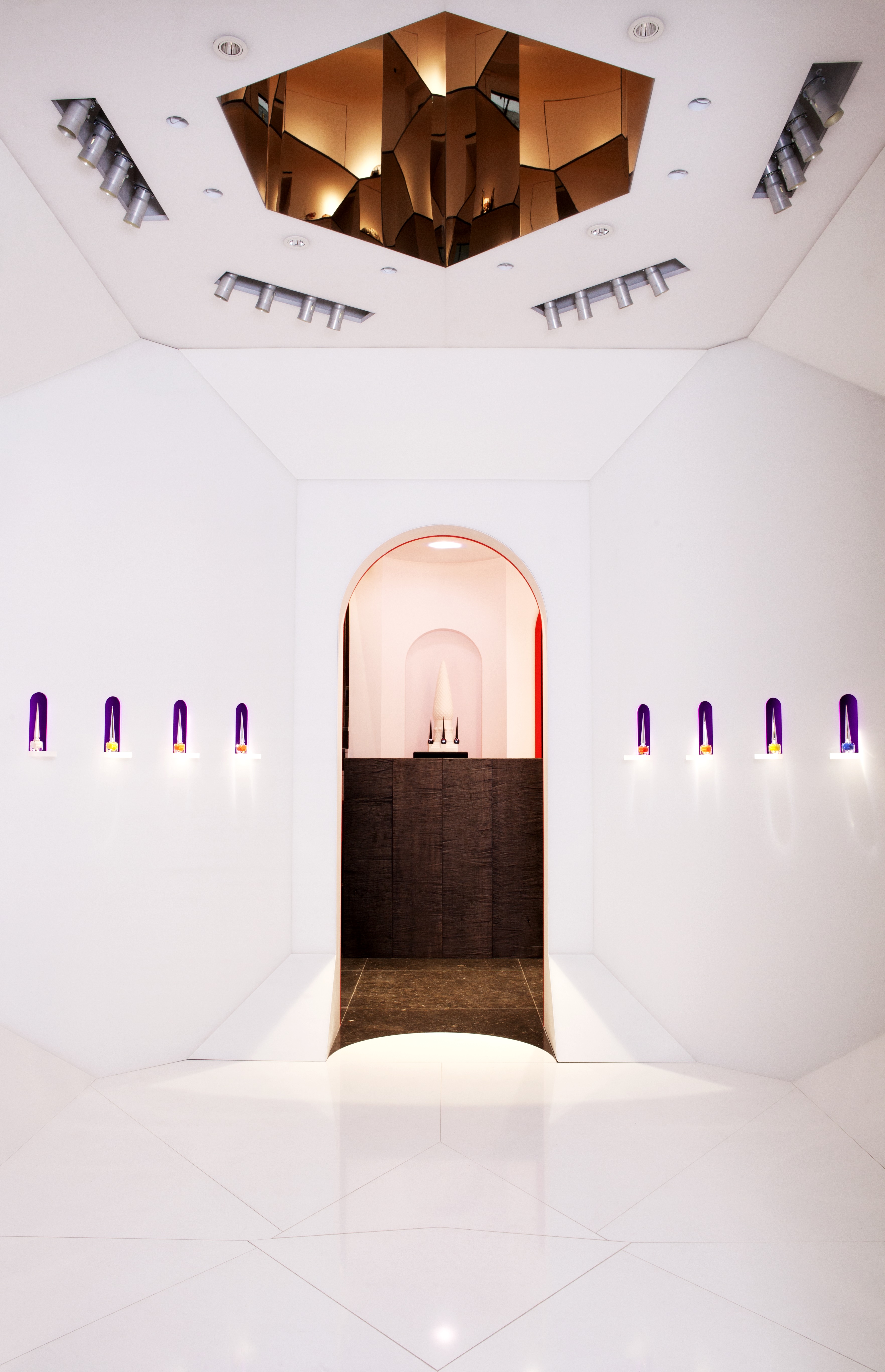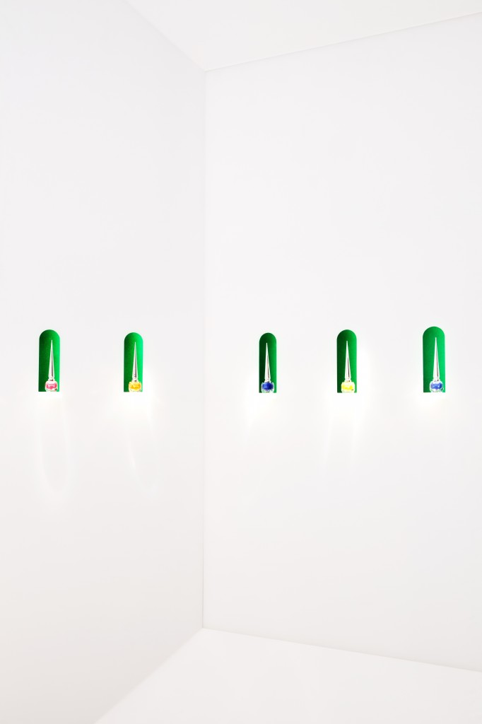 Petit détail qui a toute son importance, la couleur de l’alcôve change derrière chaque flacon mettant ainsi en lumière les différentes teintes de laque.