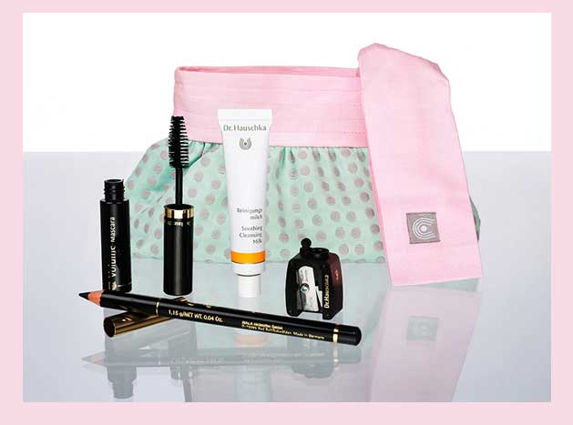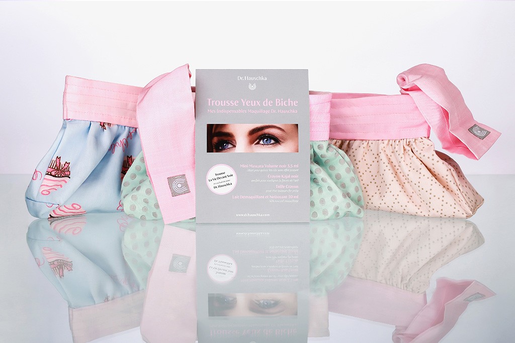 En exclusivité pour la marque pionnière de cosmétiques naturels et biologiques, La Vie Devant Soie a créé trois trousses en soie tissée main et coton bio aux motifs tendance et délicats pour contenir les indispensables Maquillage Dr. Hauschka. A l’intérieur de la Trousse Yeux de Biche idéale pour sublimer le regard, un mini Mascara volume noir, un crayon Kajal noir et son taille crayon et un lait démaquillant et nettoyant.