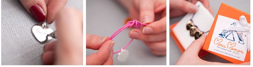 Chez Merci Maman, chaque bijou est unique, personnalisé et gravé à la main. Vous pourrez y trouver une sélection de jolis bijoux en plaqué or ou argent (colliers, bracelets, porte-clefs et même boutons de manchettes) que vous pourrez faire graver dans une élégante écriture cursive française avec le message de votre choix !