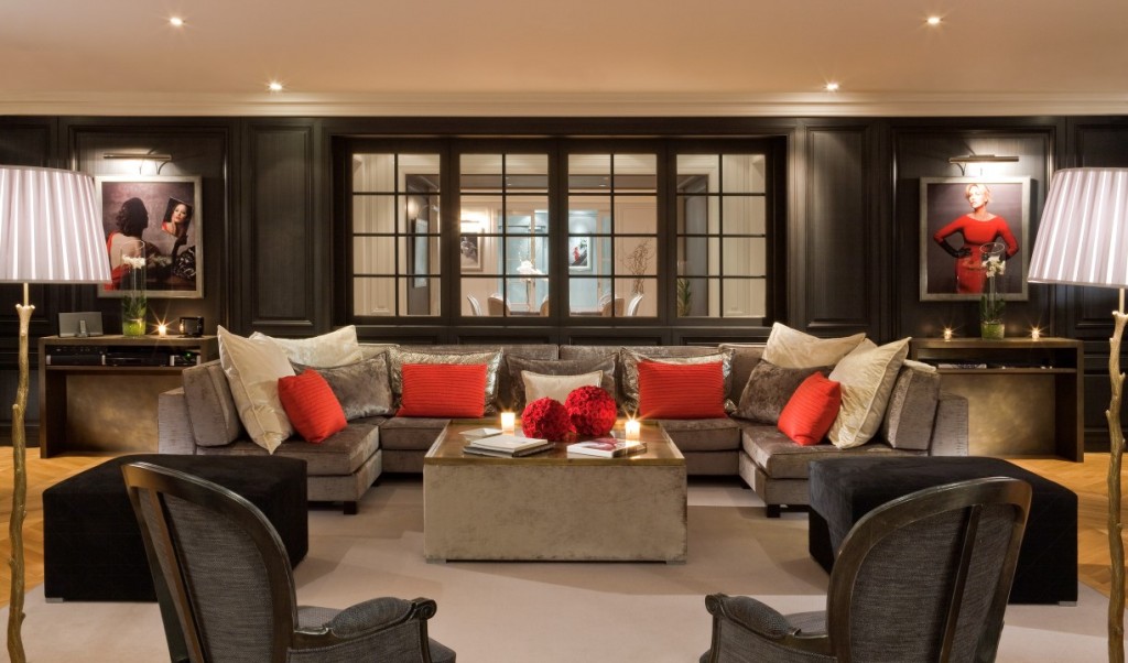 Dans le salon, les coussins en rouge Dior du canapé reprennent le motif plissé historique du couturier, s’accordant à merveille avec l’immense rideau gris Dior en passepoil rouge et les panneaux de charbon de bois moulé.