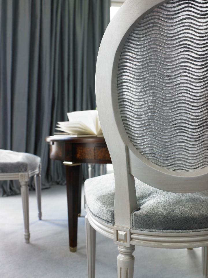 Les peintures murales, avec leur finition main, au peigne, par des artisans hautement spécialisés, évoquent les tissus chers au couturier.