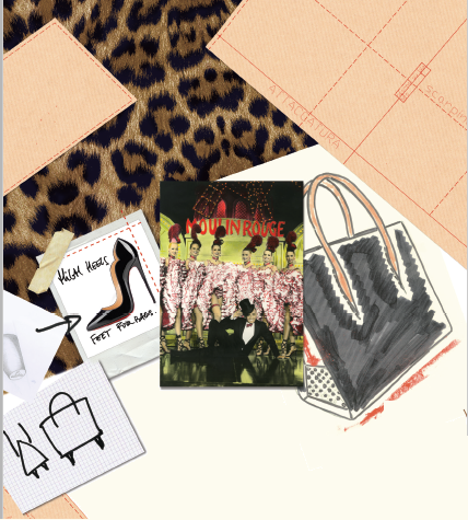 Si les spikes dorés rappellent les lumières si caractéristiques du cabaret parisien, la courbe des poignées en cuir nude évoquent quant à elles, les jambes d’une danseuse de revue aguichant son public à travers les pans d’un rideau de scène.