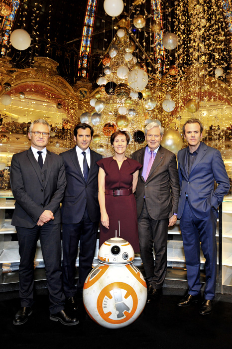 BB-8, le tout nouveau droïde héros de STAR WARS : LE REVEIL DE LA FORCE, a lancé l’illumination des festivités sous la Coupole des Galeries Lafayette accompagné de Philippe Houzé, Président du groupe Galeries Lafayette, de Nicolas Houzé – Directeur général Galeries Lafayette -, Guillaume Houzé – Directeur de l’image et de la communication Galeries Lafayette -, Agnès Vigneron – Directrice du magasin Haussmann – et Jean-François Camilleri, Président de The Walt Disney Company France devant le sapin cosmique de 25 mètres de haut, formé de météorites or et argent et dématérialisé sous une pluie d’étoiles.