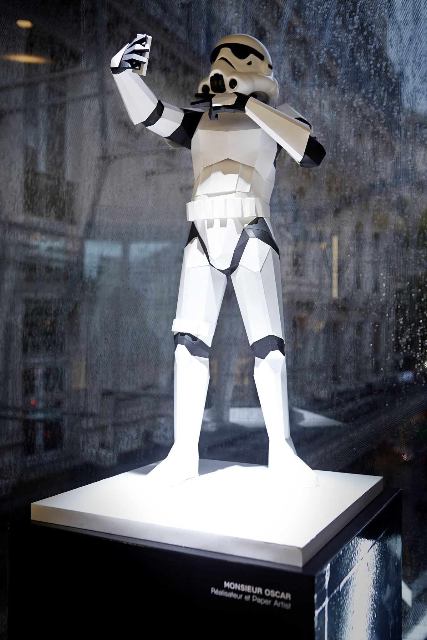 Sur la passerelle reliant les deux magasins, l’exposition intitulée Star Wars Legion vous fait découvrir comment plusieurs artistes français venus d’horizons très variés ont su réinventer les fameux casques de Stormtroopers.