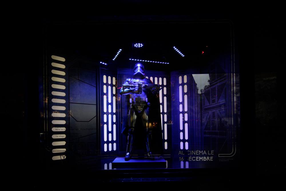 Ainsi les cinq vitrines du Lafayette Homme sont entièrement consacrées au film événement. La première révèle des Stormtroopers new look devant le drapeau du Premier Ordre, la seconde permet de découvrir le mystérieux Capitaine Phasma qui s’avèrera un futur adversaire redoutable.