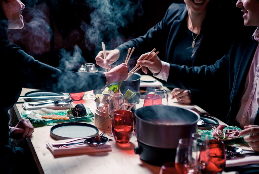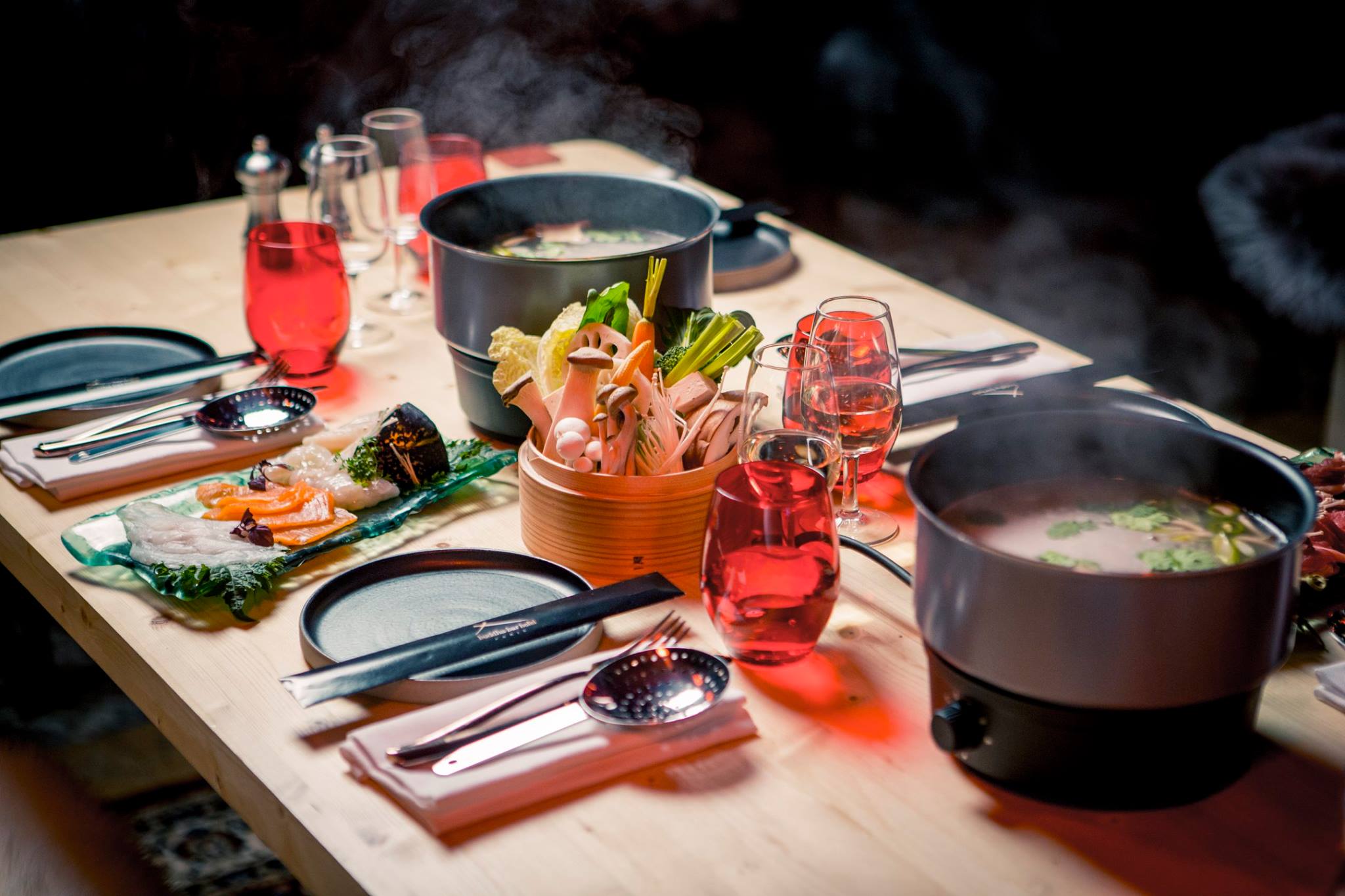 Sur les tables d’hôtes, la carte prend des allures de fête. On y partage un Shabu Shabu, une fondue chinoise d’origine mongole servie dans une marmite fumante, où se mêlent dans un bouillon épicé et salé des ingrédients de premier choix : poissons, viandes, légumes et Dim Sum.