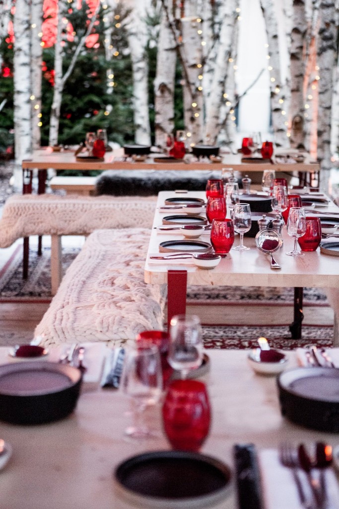 Sapins illuminés, coussins, plaids et peaux de bêtes côtoient tables de bois et décorations de fin d’année pour partager un repas dans une ambiance chaleureuse et douce.