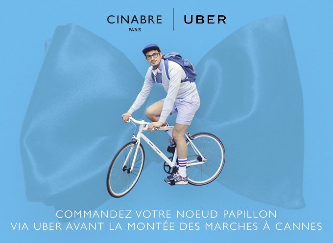 A l’occasion du Festival de Cannes, Cinabre l’habilleur de cou s’associe à Uber et propose un service unique de livraison express de nœud papillon, l’accessoire indispensable pour la montée des marches.