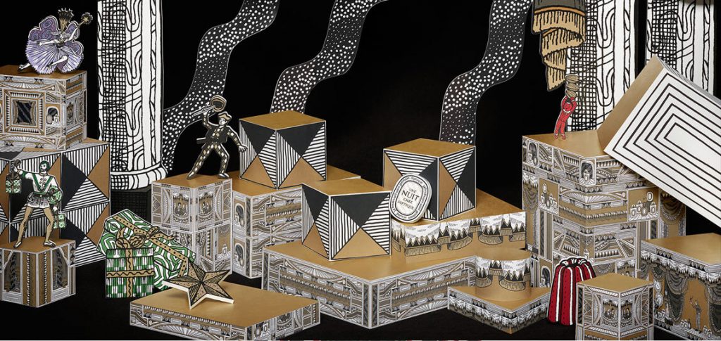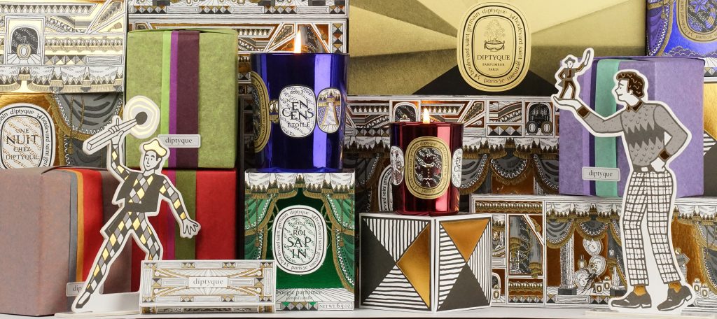 Dans ces clins d’œil aux théâtres Pollock – vendus dans le passé au sein de la boutique historique du 34 boulevard Saint Germain à Paris – sources d’inspiration du conte d’hiver « Une Nuit chez Diptyque », vous pourrez dénicher les parfums et fragrances pour la maison et les traditionnelles bougies de fin d’année en édition limitée dans leurs habits colorés et poétiques.