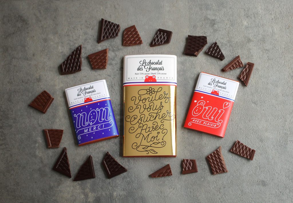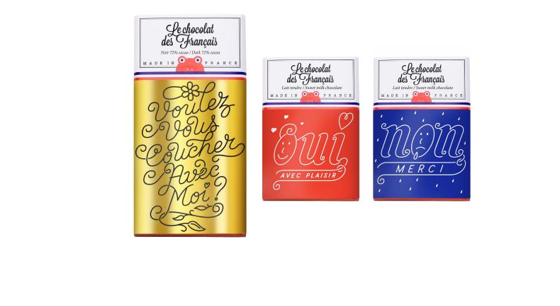 Pour la Saint-Valentin, Le chocolat des Français vous propose de surprendre votre moitié et de la faire craquer avec un trio très coquin, illustré par l’artiste Pieter Ceizer. Sur la première tablette est gravée LA célèbre question qui, de Paris à New York, brûle toutes les lèvres : «Voulez-vous coucher avec moi ?».