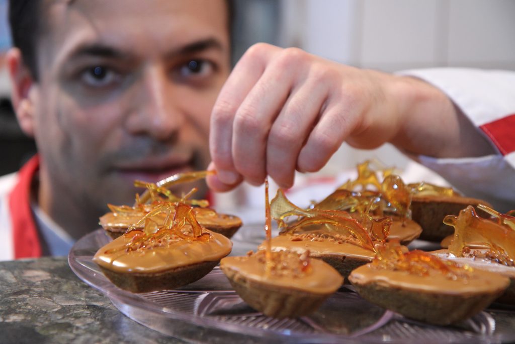 Laurent, quant à lui, s’applique à mettre nos sens en éveil. Toujours en quête de nouvelles associations, il imagine et confectionne des gourmandises œuvres d’art. Ses créations insolites sont toutes façonnées, moulées, cuites puis décorées avec soin à la main dans la journée. Du véritable travail d’orfèvre.
