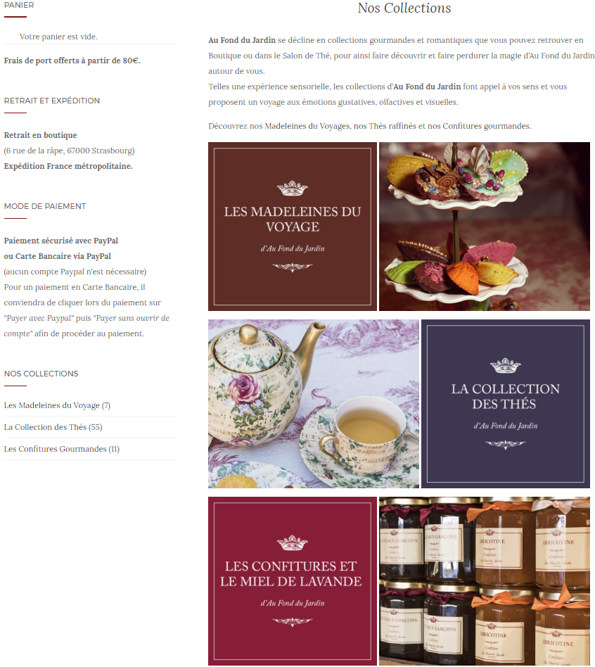 Vous pourrez y retrouver un bel aperçu des produits d’Au Fond du Jardin avec notamment les collections de thés raffinés, les Confitures Gourmandes et les Madeleines du Voyage proposées par collection éphémère. Ainsi jusqu’au 31 mai découvrez la Collection de Printemps, composée de 3 jolis coffrets décorés de 8 pièces, de 3 délicats coffrets de 4 pièces et d’un coffret duo avec la Madeleine Vendôme.