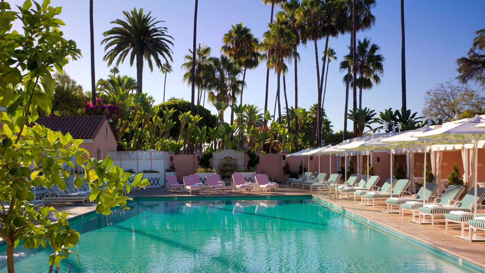 Un décor rose faisant la part belle au marbre, des rayures blanches et vertes, des palmiers et une végétation luxuriante entourant une magnifique piscine ont fait de ce petit bijou Dorchester Collection sur Sunset Boulevard une oasis en plein coeur de la Cité des Anges.