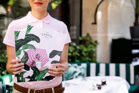 Le temps d’un été, la Terrasse Montaigne se transforme en Cabana Cafe reprenant tous les codes de la terrasse ombragée. Les stores d’un rouge intense découvrent ainsi une nouvelle ambiance plus propice à la décontraction : palmiers, banquettes et fauteuils aux rayures vertes et blanches, coussins imprimés de feuilles de bananiers, polos roses, chinos beiges et sneakers blanches pour le personnel.