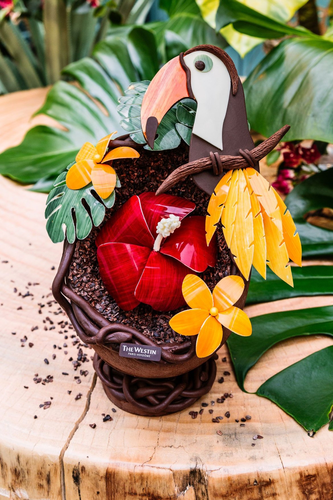 Exotique et gourmande, cette création est réalisée uniquement à partir de colorants d’origine naturelle. Les feuilles et les fleurs sont en chocolat blanc Opalys (33% cacao), l’oeuf en chocolat au lait Jivara (40% cacao), l’oiseau en chocolat noir Manjari (66% cacao) origine Madagascar et blanc.