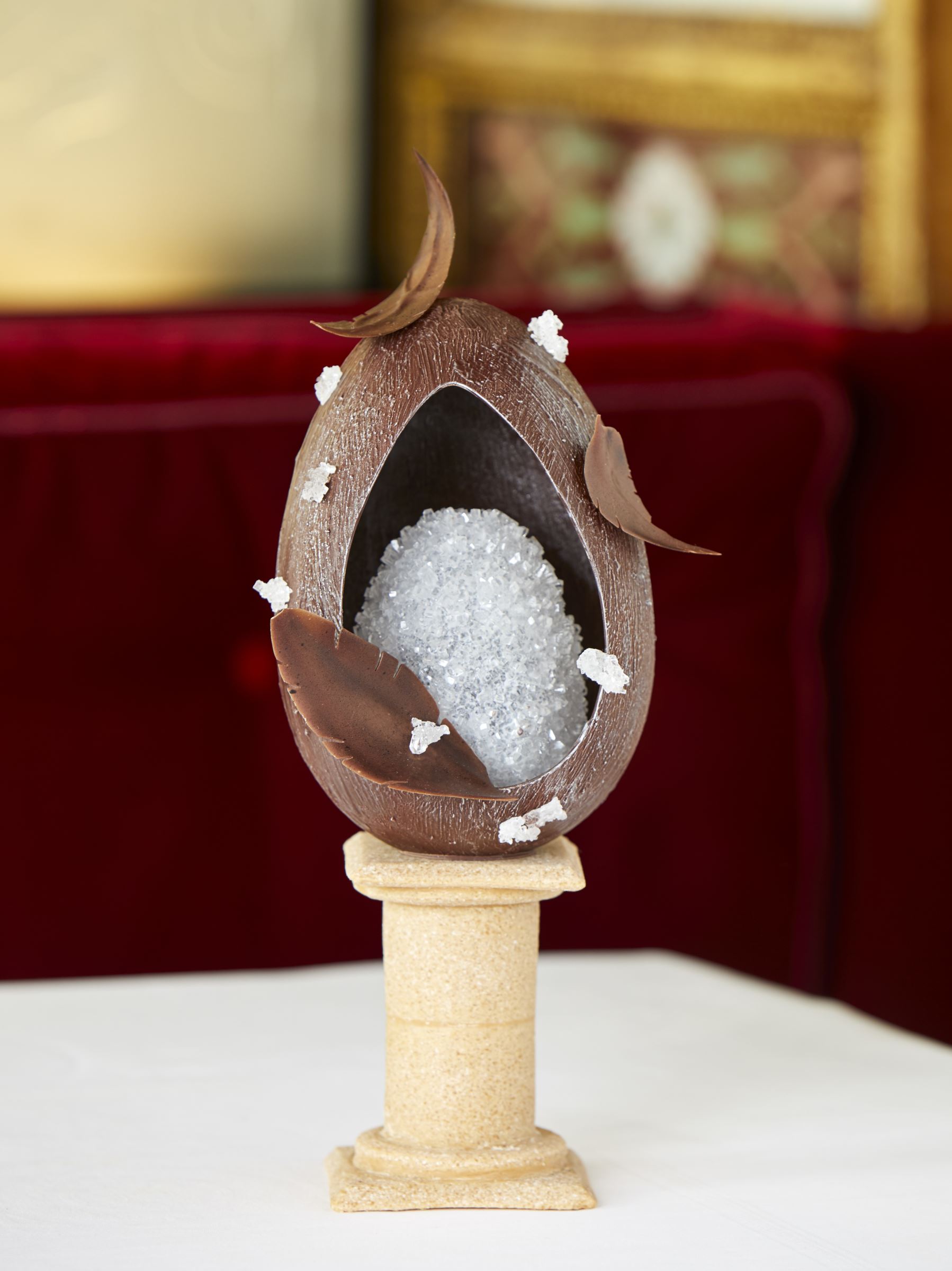 Lové dans la plus chic des boîtes (à œufs évidemment), et habillé de rouge, couleur emblématique de l’Hôtel Plaza Athénée, l’œuf entièrement confectionné en chocolat au lait est orné du sceau de l’hôtel, doré et finement ciselé.